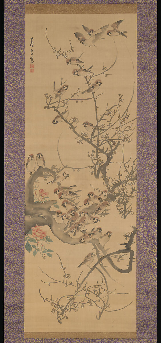 A common topic in Japanese bird-and-flower painting, sparrows and blossoming plum branches evoke the beginning of spring, which according to the lunar calendar would begin in early February. Rosetsu fills the composition with a profusion of twigs that abruptly twist and turn. The calculated disorder of the plum branches finds its echo in the numerous sparrows, many of which the artist painted in slight variations of similar poses.
