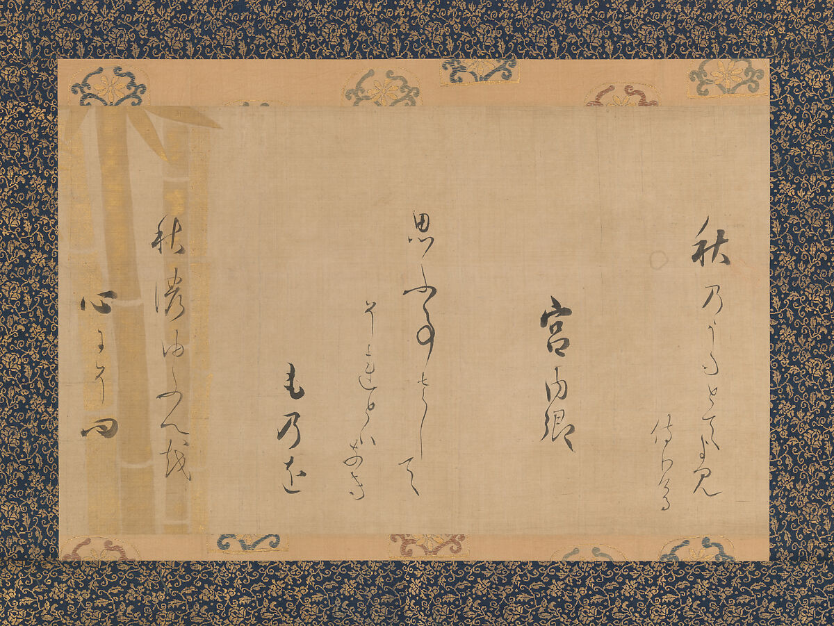 Hon’ami Kōetsu was the most prominent calligrapher of his generation, and renowned for his renditions of classical Japanese waka (court poems in 31 syllables) in a mixture of dynamically rendered kanji (Chinese characters and kana (Japanese phonetic characters). He employed an age-old technique of “scattered writing” (chirashigaki) whereby the lengths of columns were adjusted to create an attractive composition. It was comparatively rare for Kōetsu to brush poem scrolls on silk, though this work bears comparison to a section of silk handscroll with poems in the collection of the Asia Society New York. That handscroll also has painted gold bamboo decoration, and is also attributed to Tawaraya Sōtatsu, head of a studio of artists who created fan paintings, screens, and paper decoration inspired by classical painting themes. )