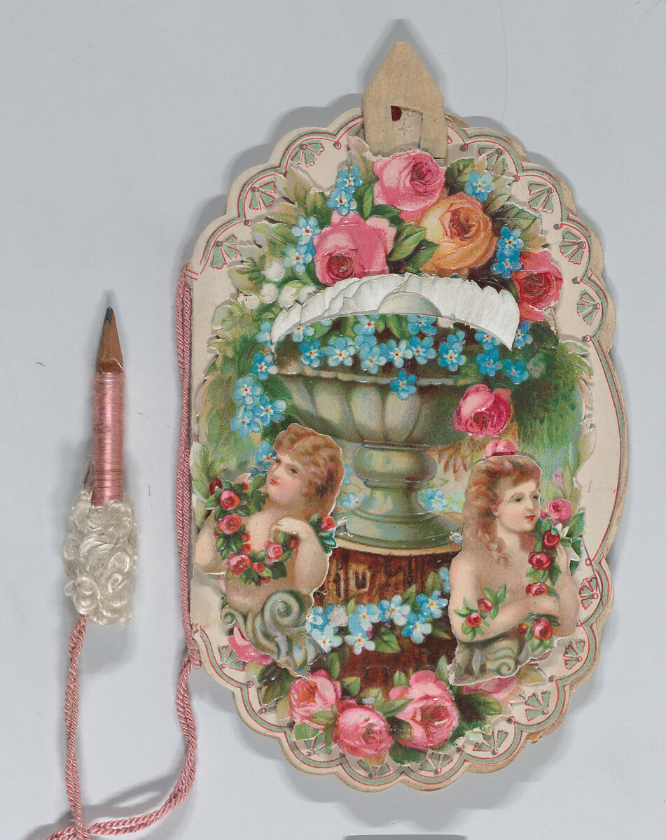 - Medium: Heavy card-stock, chromolithography, die-cut scraps, pink colored string, small pink pencil