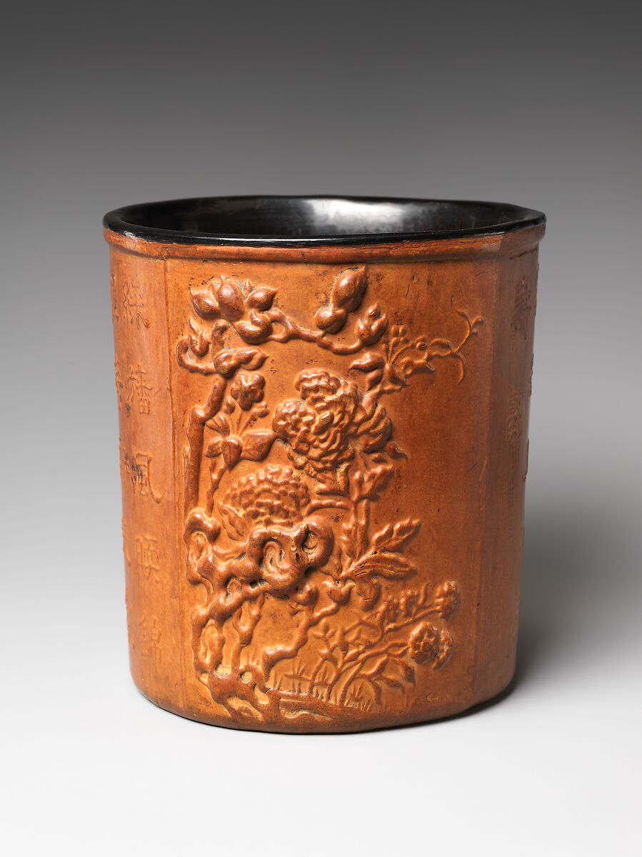 This brush holder epitomizes the kind of molded gourd vessels made in the imperial workshop during the Qing dynasty. These ingeniously crafted containers were made by encasing a young gourd in a wooden mold composed of several sectional wood panels with engraved motifs. As the gourd grew, it filled the mold and took its shape, including the surface decoration.