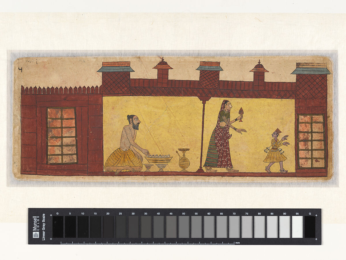 These four folios (2018.360–.363) from a dispersed manuscript of fifty leaves, can be securely attributed to the hill schools (Pahari) of northern India on the basis of the ink annotations in Takri script, a variant of Devanagari, widely used in the hills. However, the precise school or atelier remains elusive. The paintings display a folkish hand emulating a courtly style, and the limited range of colors employed points to an atelier at which the more expensive pigments seen elsewhere in Pahari court paintings were either not available or unaffordable. The paper employed is in the horizontal format that persisted in provincial sub-schools of Indian painting, particularly those in the relative isolation of the remoter hill valleys of northern India, the probable home of the atelier responsible for this series. The style resonates most strongly with the Nurpur and Mankot sub-schools of Basholi court painting, in Himachal Pradesh.