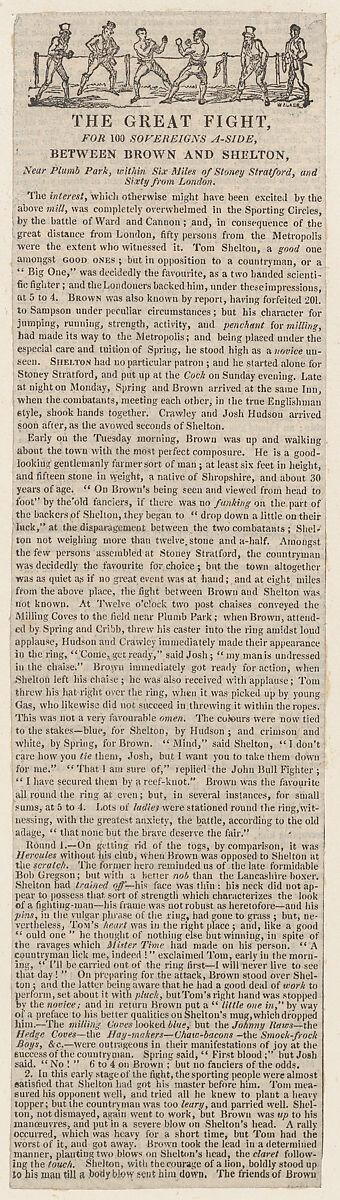 This column, decorated with a small woodcut, appeared in Pierce Egan's newspaper "Life in London. The text describes a boxing match between Tom Brown and Tom Shelton, in 1824 at Plumb Park, near Stoney Stratford, sixty miles from London. The image shows two pugilists stripped to the waist, accompanied by their seconds, with a bottleman and referee. The text notes that distance from London, and competing interest in another match, limited London spectators to about 50.