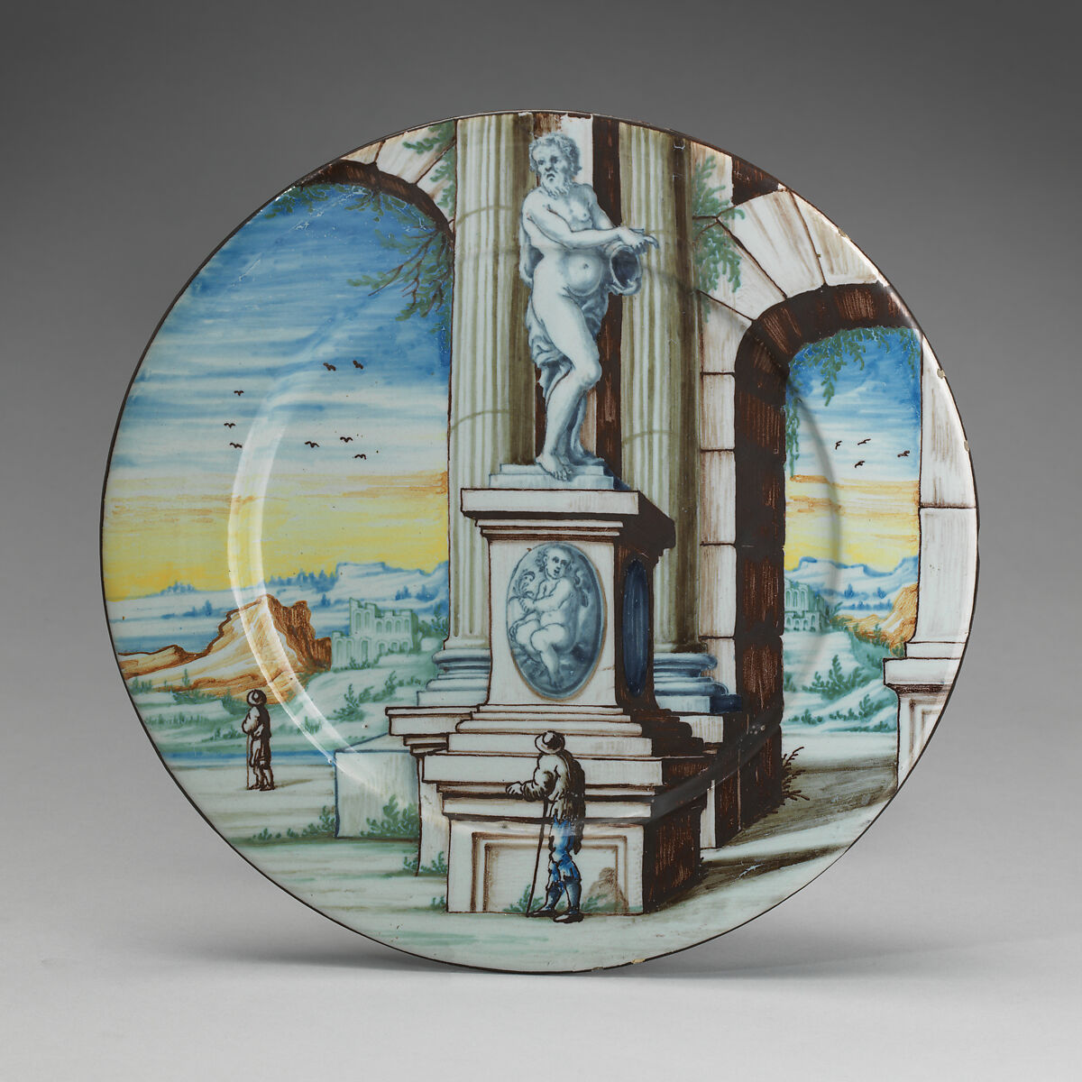 Landscapes with architectural ruins feature prominently on maiolica dishes made in Pavia, a city in the Lombardy region of Italy, during the late seventeenth and early eighteenth century. In spite of their natural setting, the imaginary vistas painted by Siro Antonio Africa and his nephew Siro Domenico evoke the extravagant theater sets of the Baroque stage.