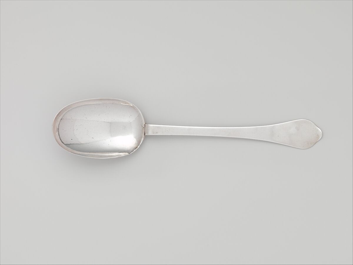 According to the donor, this spoon was first owned by Captain Samuel Hanford (b. 1710), who had it initialed for his grandson, Elisha, as a porridge spoon.
