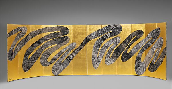 Across a brilliant gold-leaf background, the artist fashioned a wide undulating line from traditional Japanese paper (washi) soaked in ink and crushed-shell pigment (gofun) and then pressed into compact folds. The pair of screens is titled Kyoku, which in Japanese can mean “bend,” “curve,” “music,” or “tune” and is also the term used to describe the individual panels of a folding screen. The artist said of this work, “In the vicissitudes of life, we twist and turn, go and return, but always we aspire to move forward.” This idea and the musical connotations of kyoku led to the work’s English title: Life’s Symphony.