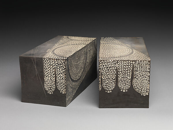 Kondō Yutaka studied under three Living National Treasure ceramists (including his own father) at Kyoto City University of Fine Arts. He was inspired by the ancient Indian motif of the sacred footprint that the Buddha was said to leave wherever his message was heard. Yutaka impressed the surface with decorative patterning and miscellaneous texts, including the names of countries, cities, and entertainment districts in Kyoto and Tokyo that reveal the artist’s personal journey.