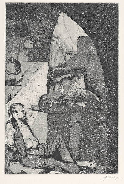 Goldyne uses his art to explore printmaking methods and techniques, as well as the broader history of art. In his early works, such as The Hard Cell: Chardin's Brioche Contemplated against Goya’s Wall (1975) he employed traditional printmaking techniques, such as etching and aquatint, as well as monoprint manipulations. The print is based on a figure from Honoré Daumier’s lithograph Moderne Galilee (1834) and the setting of Goya’s aquatint Woman in Prison, to which Goldyne has added surrealist elements--a brioche and an apple--from a still life by Chardin, revealing perhaps the thoughts or even hallucinations of the prisoner.