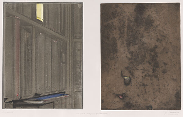 In this work, Goldyne engages the importance of experimentation and the role of the accident. The two images, each of which measures 12" x 9," were printed from separate plates on one sheet of paper. They are impressions of the recto and verso of the same plate. The work is based on an "accident" in which Goldyne left tape and glue fragments on the verso of a plate he was printing. The acid bath caused these materials to leave an etched pattern he found interesting and pursued in this work, in which he inked and colored impressions of both sides of the same plate, which he printed next to each other.