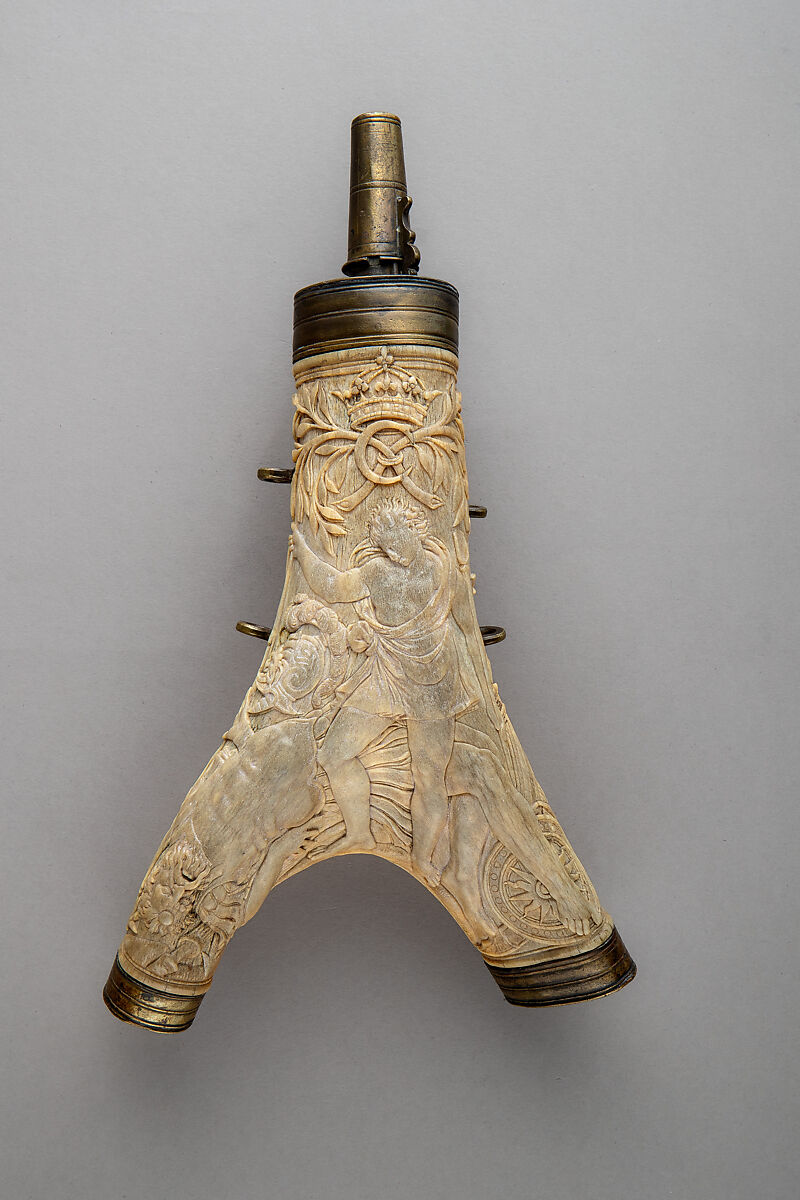Exceptional for the design and execution of its ornamentation, this flask belongs to a small group carved by an anonymous French Renaissance artist. The flask occupies a special place in the group, as it is one of only two examples decorated with a biblical subject, and the only one to feature a royal cypher––that of Charles IX of France (1550–1574, reigned from 1560). The flask establishes that the artist was thus working in the ambit of the royal court.