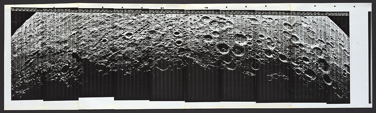 NASA's Lunar Orbiter program of 1966-67 was the agency's final and most successful photographic project before the crewed lunar landings of the Apollo program. Over the course of one year, five probes systematically photographed 99 percent of the lunar surface. The Orbiters investigated potential landing site, revealing features as small as one foot in diameter. The program used a film-based robotic imaging system designed by the Eastman Kodak Company. The images were captured on 70 mm film with a dual-lens camera, chemically processed on board, scanned in strips, and transmitted via radio back to earth. At Eastman Kodak headquarters in Rochester, New York, technicians transferred the scanned strips onto sheets of large-format film from which they printed the final photographs. This stunning panorama, which shows the moon's curved horizon at either end, captures the harsh beauty of the lunar landscape as it appears from outer space.