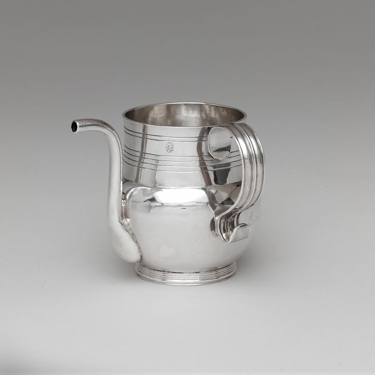 One of the specialized forms of drinking vessels produced in late seventeenth-century America was the spout cup. The long, narrow, sharply curved spout enabled a child or bedridden adult to sip more easily from the cup, the handle of which was placed at right angles to the spout to assist the server. On this example tooth marks are evident around the open end. This cup belonged to Elizabeth Greenleaf, who is thought to have been the first female apothecary in America.