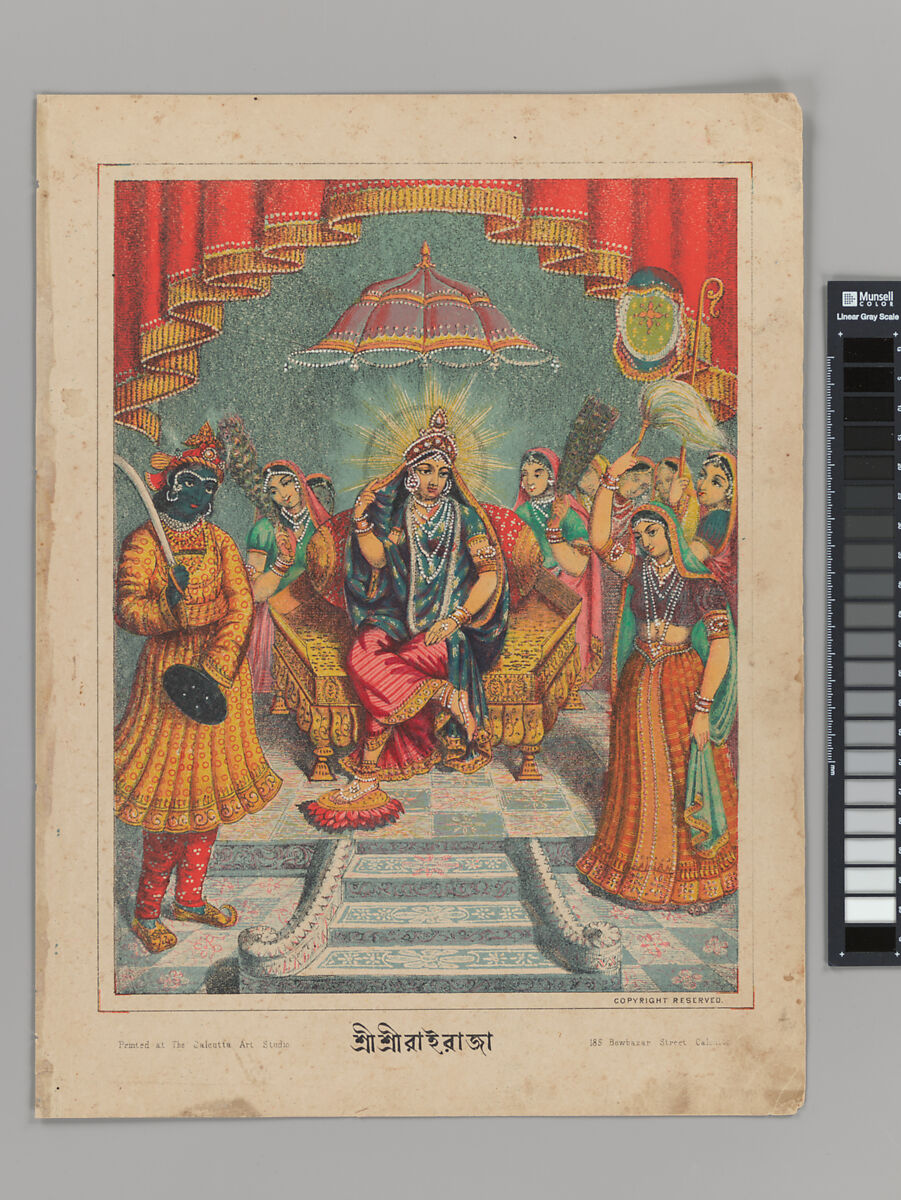 Rai Raja, with a radiant golden aureole, sits on a hexagonal golden dais under an umbrella with raised red curtains withgold tassels above, suggestive of a stage setting. Two female attendants cool her with peacock feather fans. In the foreground, she is flanked to the left by a blue male figure holding a sword and shield and on the right by a female flywhisk (chauri) bearer. The floor and stairs are decorated in the manner of late Victorian glazed tiles.