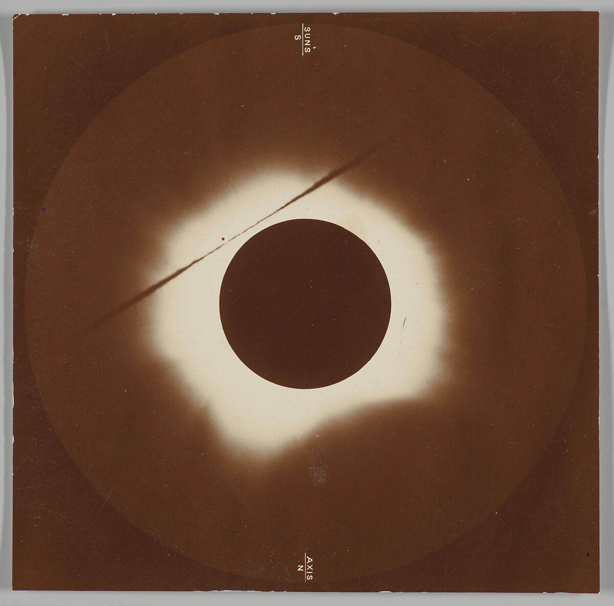 On May 6, 1883, a dramatic total eclipse plunged the Sun into darkness for nearly six minutes. Several expeditions of prominent astronomers from the United States, Great Britain, France, and Italy convened on Caroline Island, a remote coral atoll in the middle of the Pacific Ocean, to observe and document the event. During the two weeks before the eclipse, the teams set up several makeshift observatories in canvas tents, as well as numerous free-standing telescopes, spectroscopes, and other astronomical instruments. Lawrence and Woods, British astronomers who sailed with the American mission on the U.S.S. Hartford, collected spectrographic data and recorded the eclipse with eleven cameras simultaneously. Among the images they captured was this striking view of the totality.