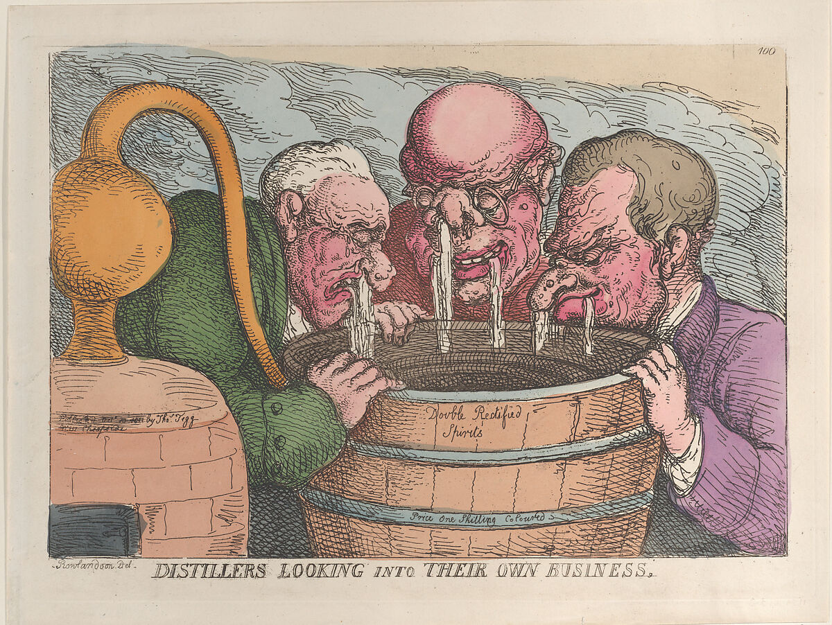 A repulsive scene with three old men with grotesque and hideously carbuncled faces looking into a cask of "Double Rectified Spirits," while their noses and mouths stream copiously.