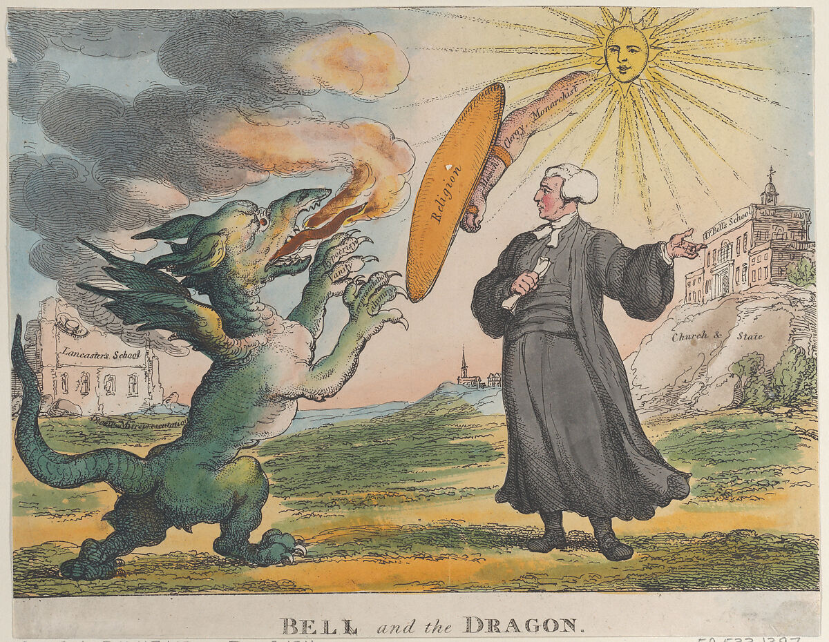 A fire-breathing dragon advances towards a clergyman. He stands beneath the sun, which projects an arm and a shield in front of the dragon. Publisher's address is trimmed off.