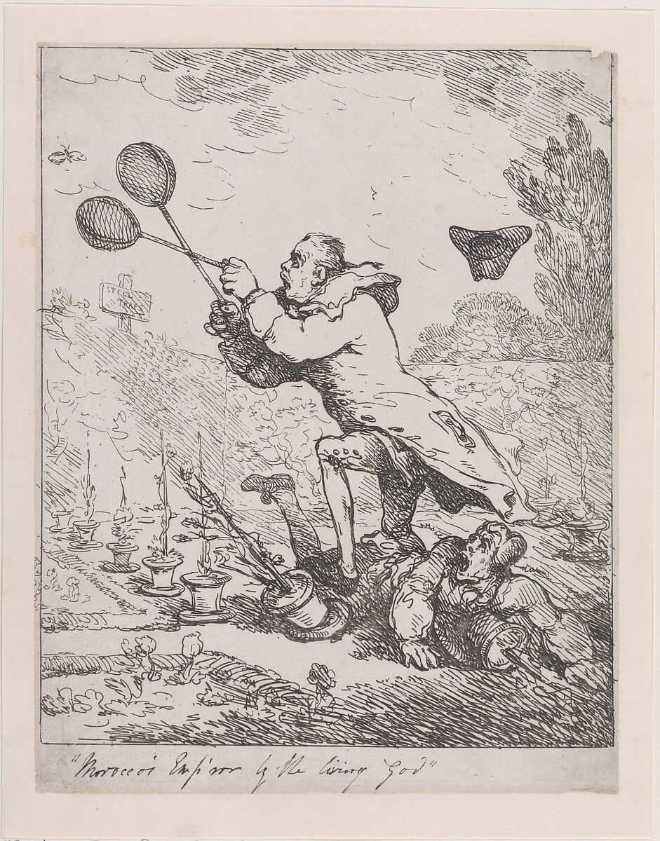 Sir Joseph Banks is shown pursuing a butterfly with a scissor-like net, in a walled garden. He steps over a gardener who lies sprawled on the ground, knocks over pots, and loses his hat which flies off behind.