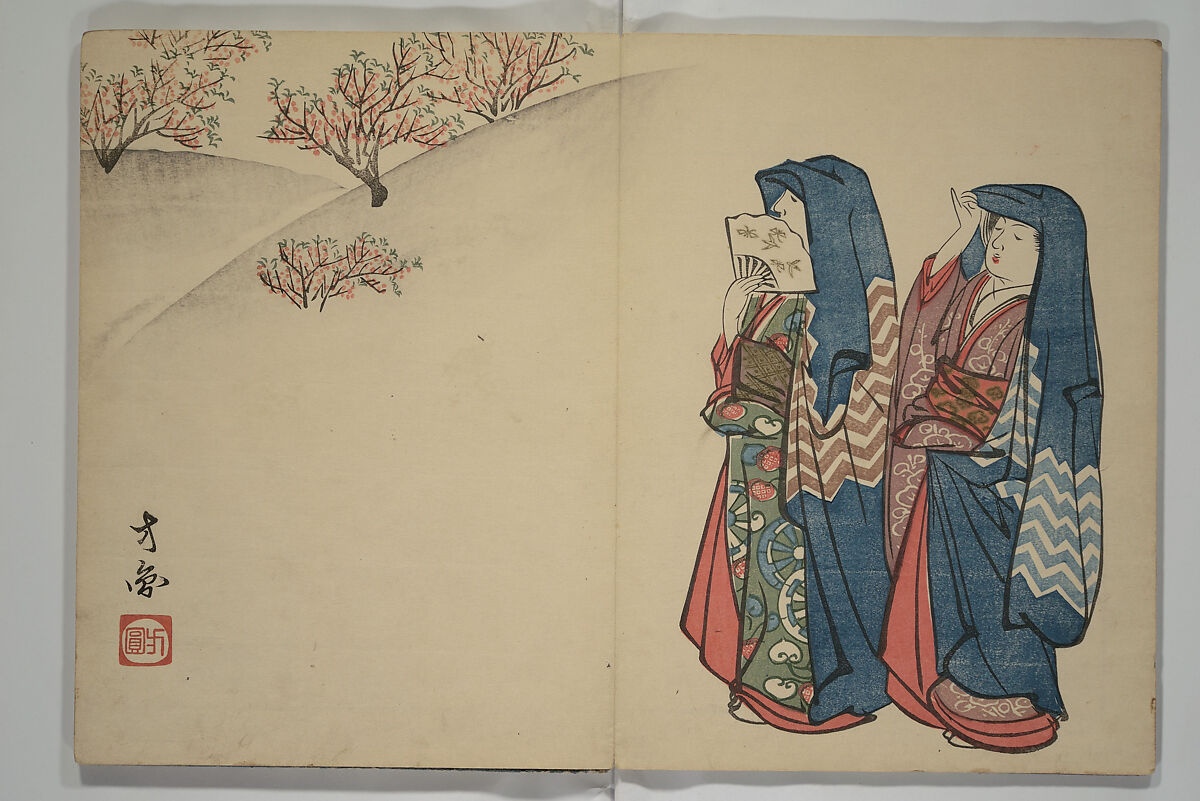 - Medium: Woodblock printed book (orihon, accordion-style); ink and color on paper with metallic pigments