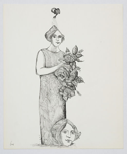 After moving to New York 1976, his style changed to focus increasingly on compositions influenced by the collapsed perspective and mid-ground composition of Persian miniature painting. At the same time, he rendered figures in a loose and vividly animated line. Scenes depicting literary, courtly and religious themes became common. In this work, a woman in a sleeveless shift dress and bobbed hair holds a bouquet of enormous roses. Above, a watering can rains water onto her head, while at her feet another head resembling that of the woman’s grows. The ink drawing was published originally in Ardešir o havā-ye ṭufāni (Ardeshir and Stormy Winds) (Tehran: Tus Publication, 1973). In his introduction to the book Ali-Aṣḡar Ḥāj Sayyed-Javādi noted that Ardeshir "senses a stormy wind and observes the creatures who tumble about in this wind: the one who flees and the one who stands; the one who lights a lamp for the victims of the storm, and the one who steals the light and leaves the rest to the darkness."