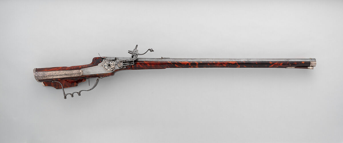 This fine wheellock Eevenrifle is a rare example of a distinctive class of luxury seventeenth-century sporting firearms that chiefly stand out for the striking adornment of their stocks with unconventional—and sometimes eclectically combined—materials and decorative techniques. The metal components are predominantly plain, allowing the highly burnished and translucent scarlet veneer of the stock to be the primary focus of viewer’s attention. The veneer, made from the shells of Asian tortoises, is a potent manifestation of the Baroque predilection for the unusual and eccentric, applied to the gunmaker’s art.