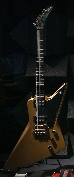 Maple and walnut body and neck, ebony fingerboard; 24¾ in. scale; flat gold finish; set neck with dot inlays; “scimitar” headstock with truss rod cover inscribed “E/2” and inlaid mother-of-pearl Gibson logo; two humbucking pickups with coils exposed, three-way selector switch, two volume controls and one tone control; gold Kahler locking vibrato bridge and nut, gold tuners, clear and black plastic barrel knobs, three-ply black and white plastic pickguard; stock bridge replaced