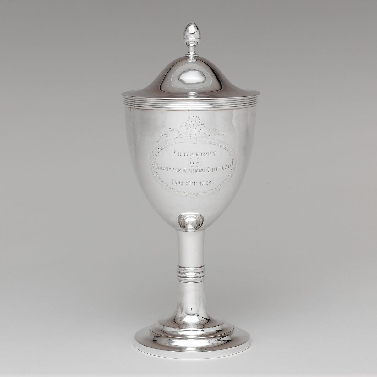 By the end of the eighteenth century the traditional bell-shaped wine cup on baluster stem had evolved into an even more restrained model. Here, the ovoid body, horizontal ribbed ornament, and bright-cut engraving reflect the neoclassical idiom. Tall, cylindrical stems on stepped, circular bases and domed covers with acorn finials accentuate the verticality and dignity of this vessel and its mate (33.120.232a, b), which were made around 1800 for Boston’s Brattle Street Church. The mark of Joseph Foster, the pair's maker, appears on a considerable quantity of Boston-area church plate.