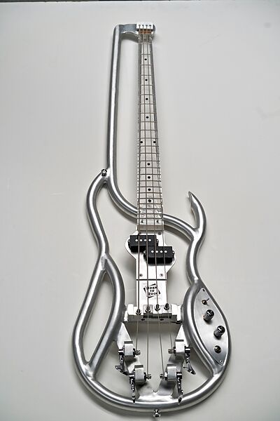 This work of art is currently on loan to the museum.Born to Rock’s patented design relies on a lightweight aluminum tube frame that holds the strings at tension over a tension-free neck, which avoids the warping associated with wooden instruments. The open, skeletal design has no conventional headstock, and the tuners are mounted below the bridge at the bottom of the body.