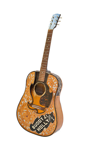 This work of art is currently on loan to the museum.Though Buddy Holly was famous for performing with a 1954 Fender Stratocaster, he composed many of his hits with this wartime Gibson J-45. It is probably the acoustic guitar used to record “Everyday,” “Send Me Some Lovin’,” and “It’s Too Late.” Holly was likely inspired to add the hand-tooled leather cover, a popular decoration among country-western guitarists, when he saw one on the cover of Elvis’s 1956 debut album. The leatherwork features the titles of several of Holly’s songs and the name of his home state. A leather-tooling enthusiast, Holly probably made it himself.