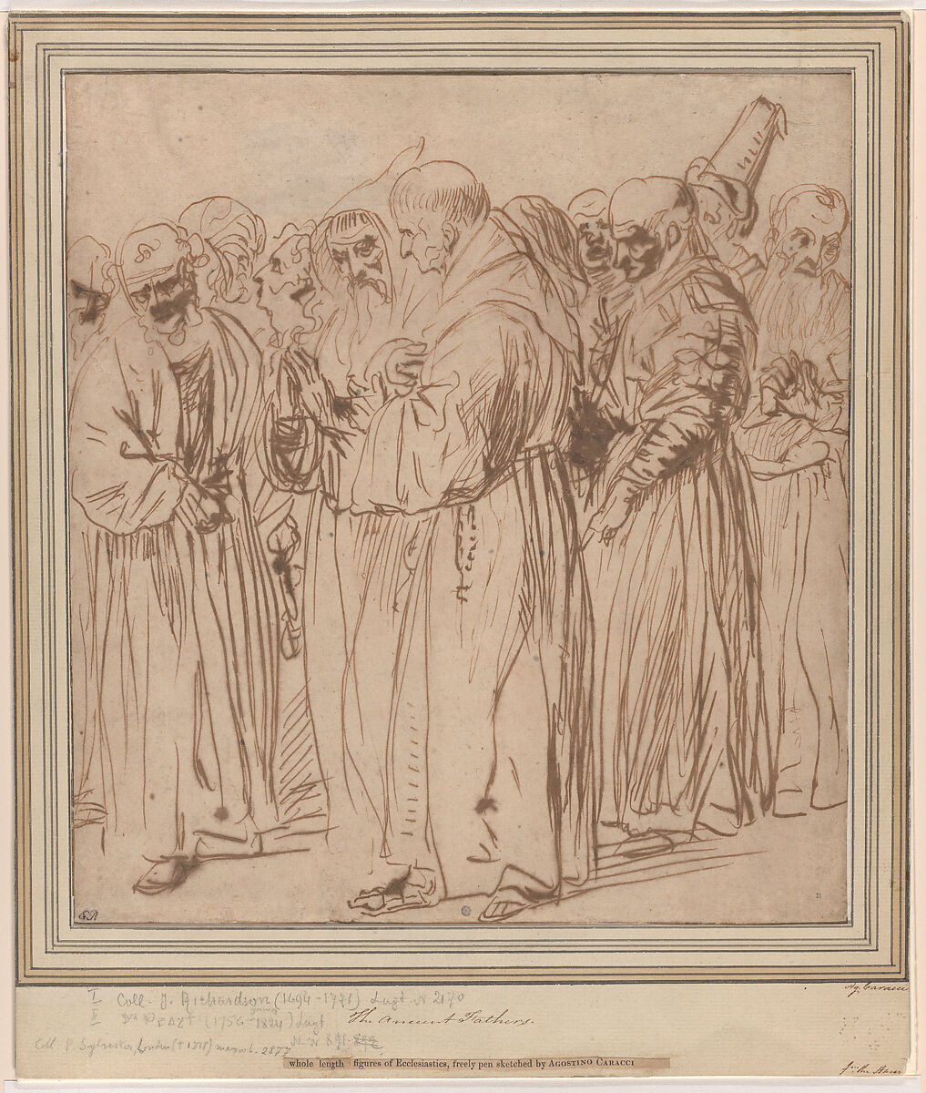 This outstanding, large sheet by Jan Lievens is one of the rare figure studies by the artist whose drawn oeuvre is composed mostly of landscape and portrait drawings. Lievens, probably best known as Rembrandt’s early studio mate, spent a good deal of his career beyond the city of Amsterdam, in London, Antwerp, The Hague, and Dusseldorf and his peripatetic life is reflected in the diverse sources of inspiration and the demands of varied patronage that can be observed in his work. His varied subjects and styles have led to the artist’s drawings often eluding correct attribution. An 18th-century attribution to Agostino Carracci is inscribed on the mount of this drawing, however, the loose handling of the pen here relates stylistically to drawings by Lievens including a sheet of figures and head studies in the Kunstmuseum Dusseldorf and a sheet with a river god in a private collection.
