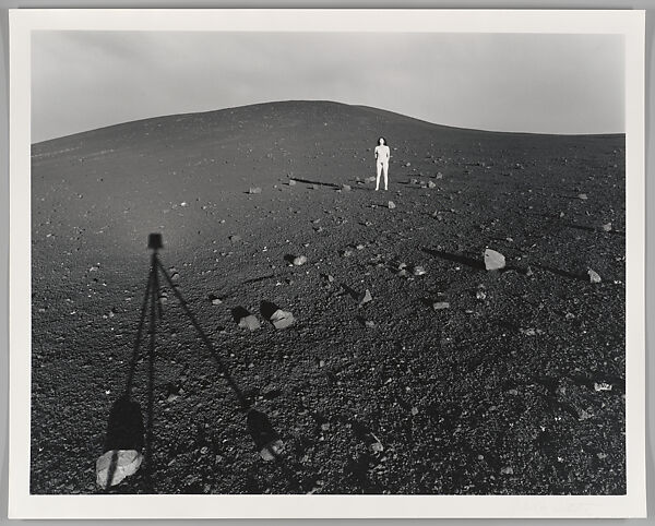 This photograph is from a series of self-portraits Dater made during ten trips to national parks in the western United States between 1980 and 1983. The small, stark white figure of the artist appears otherworldly within the barren volcanic fields known as Craters of the Moon (Idaho.) The shadow of a camera tripod in the foreground heightens the impression of an alien landscape, and evokes the iconic photographs made by Neil Armstrong during the Apollo 11 Moon landing. The artist recalls making this association only after seeing the negative; as both photographer and subject, she set up the shot and had just ten seconds to pose before the automatic shutter released. Blending traditions of self-portraiture and landscape photography, Dater’s series also relates to contemporaneous performative earth works by Ana Mendieta as well as outdoor nude studies by her mentor, Imogen Cunningham.