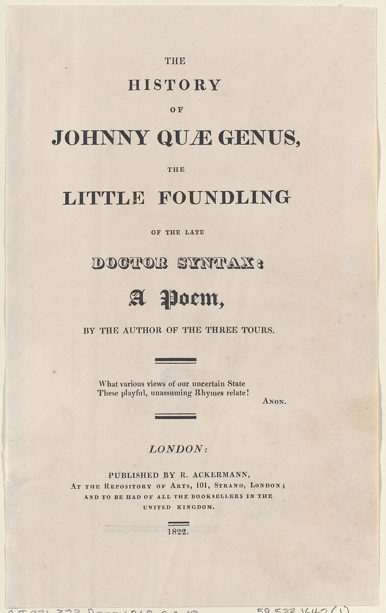 - Series/Portfolio: "The History of Johnny Quae Genus, The Little Foundling of the Late Doctor Syntax"