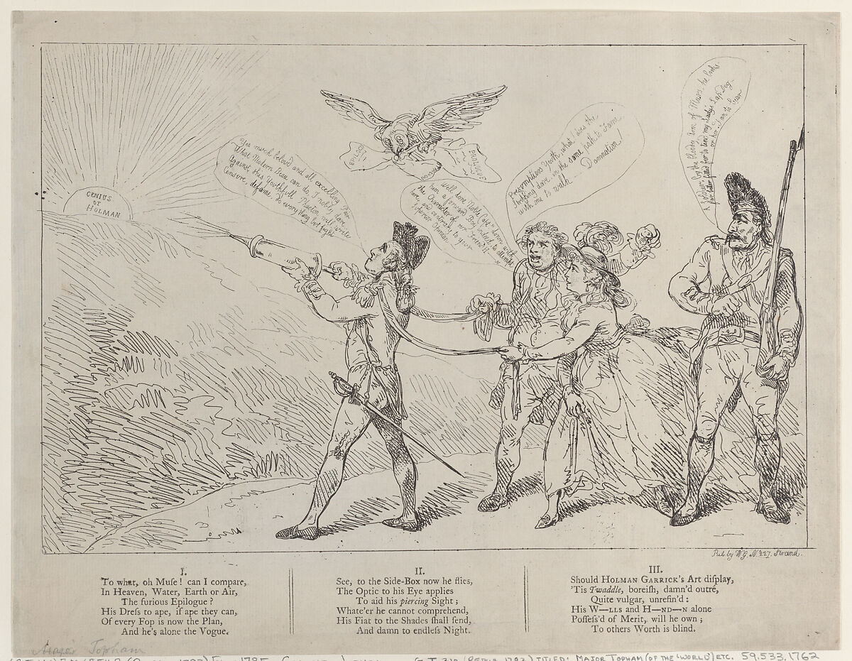 Topham points a syringe at the sun, which is inscribed "Genius of Holman." Mrs. Wells and John Henderson stand behind him holding strings that are attached to his regiments. An owl flies overhead.