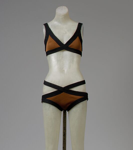 This bikini of brown wool knit with black wool banded edges is an amalgamation of angles. The top is composed of four triangles with all edges traced by wide, flat strips of black knit. The bottom, also traced in black, has additional black bands attached at the low-slung waistline that criss-cross once around the midriff. With this collection, Gernreich pays homage to Georges Rouault (18711958), a French Expressionist painter known for bordering his images with thick black lines.