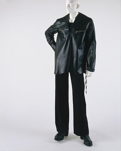 A sailor's middy is now a torn piece of leather. Gaultier uses the ripping less as process the way Kawakubo does and more as narrative. He turns the crisp sailor of the heroic H.M.S. Pinafore into the louch Cocteau sailor, somewhere between a leather bar and On the Town.