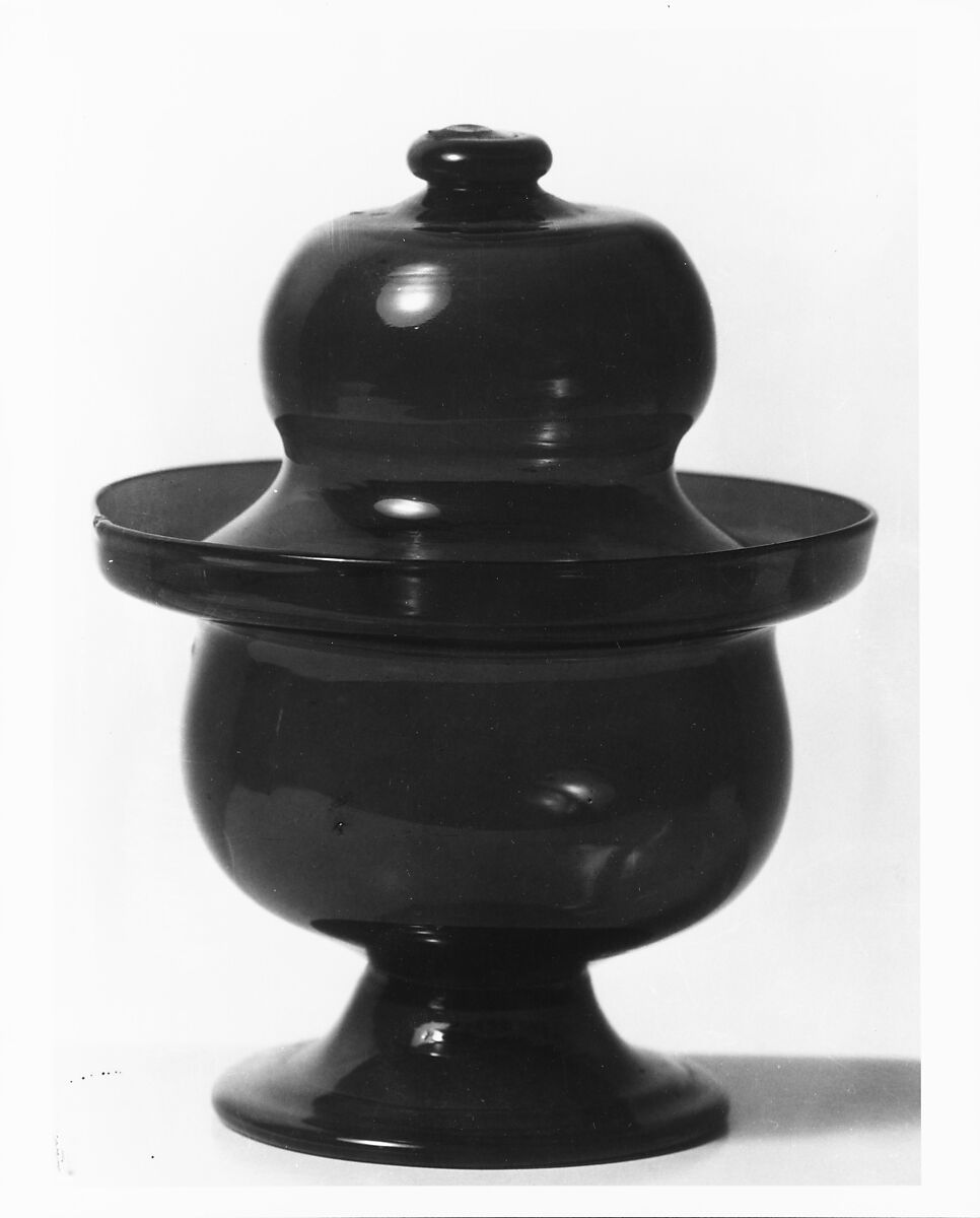 Midwestern glass factories, known for their use of distinctive colors, produced a quantity of fine, unadorned tableware in blue, amber, and purple. This sugar bowl, with its galleried rim and bulbous domed cover, is typical of both region and period.