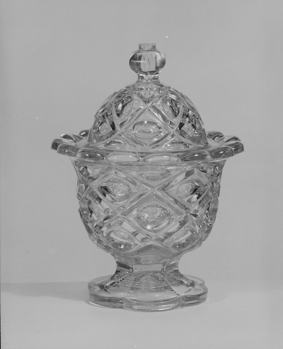With the development of new formulas and techniques, glass-pressing technology had improved markedly by the late 1840s. By this time, pressed tablewares were being produced in large matching sets and innumerable forms. During the mid-1850s, colorless glass and simple geometric patterns dominated. Catering to the demand for moderately-priced dining wares, the glass industry in the United States expanded widely, and numerous factories supplied less expensive pressed glassware to the growing market. At the Exhibition of the Industry of All Nations at New York’s Crystal Palace in 1853, for example, the New England Glass Company exhibited 130 pieces of one design, "consisting of bowls, tumblers, champagnes, wines, and jelly glasses." This object belongs to one such service. Although the glass manufactory is not known, the glassware is very typical of the large services that were very popular with America’s middle class in the nineteenth century.