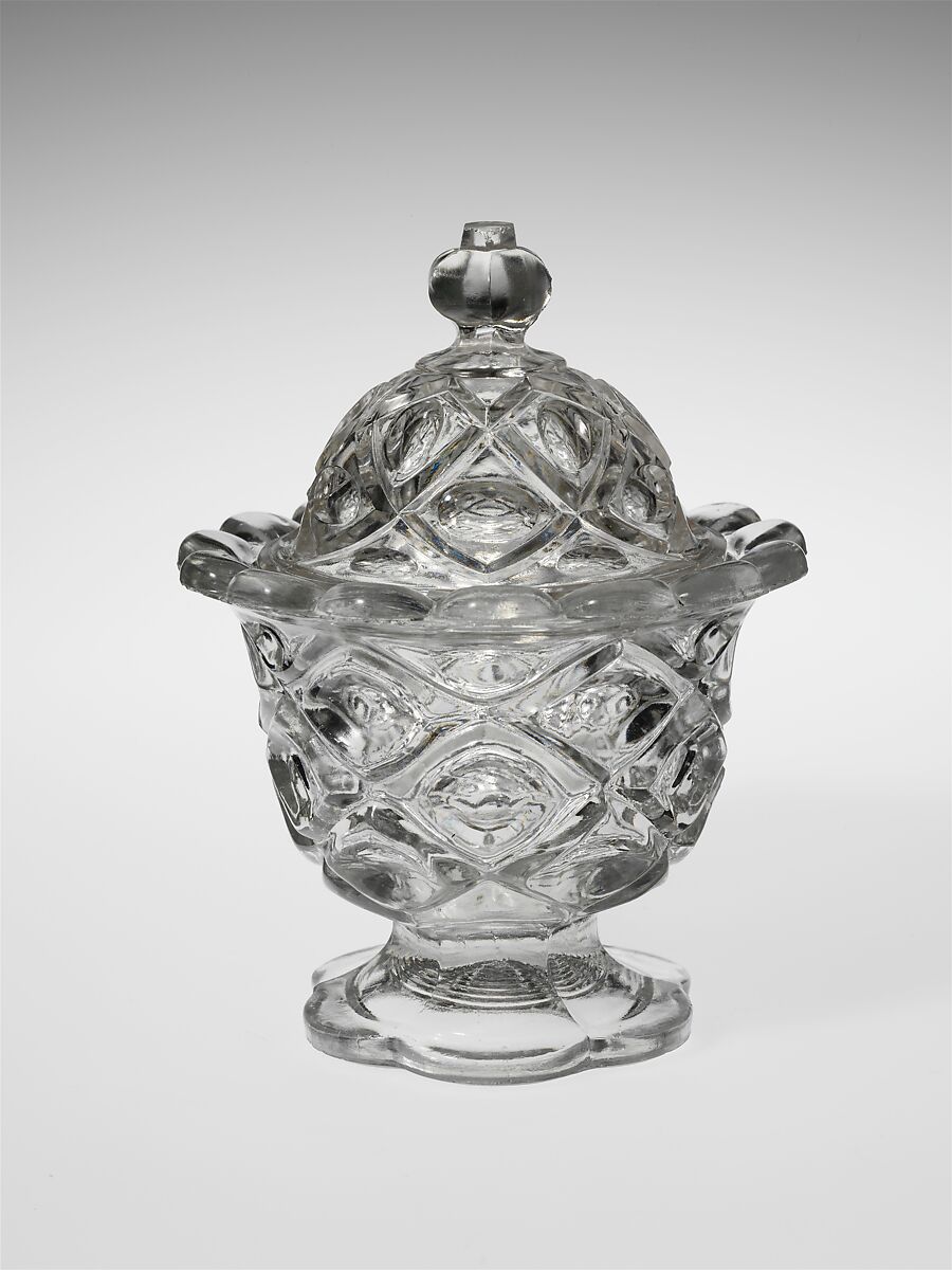 With the development of new formulas and techniques, glass-pressing technology had improved markedly by the late 1840s. By this time, pressed tablewares were being produced in large matching sets and innumerable forms. During the mid-1850s, colorless glass and simple geometric patterns dominated. Catering to the demand for moderately-priced dining wares, the glass industry in the United States expanded widely, and numerous factories supplied less expensive pressed glassware to the growing market. At the Exhibition of the Industry of All Nations at New York’s Crystal Palace in 1853, for example, the New England Glass Company exhibited 130 pieces of one design, "consisting of bowls, tumblers, champagnes, wines, and jelly glasses." This object belongs to one such service. Although the glass manufactory is not known, the glassware is very typical of the large services that were very popular with America’s middle class in the nineteenth century.