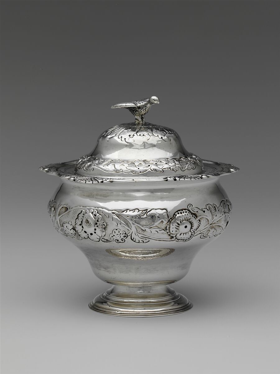 As sugar became more readily available in the eighteenth century, sugar bowls, usually with covers, became an essential part of tea equipage. Horizontal bands of naturalistic flowers and foliage chased in high relief transform this classic doublebellied sugar bowl into a fully developed expression of the rococo style. Rather than encasing the entire body and cover in an overall decorative scheme, however, the designer created compact bands of exuberant ornament that offset the smooth plain surfaces of the curvilinear forms. Relatively rare in American silver, cast finials in the form of birds, as seen here, date mainly from the mideighteenth century and possibly derive from English prototypes.