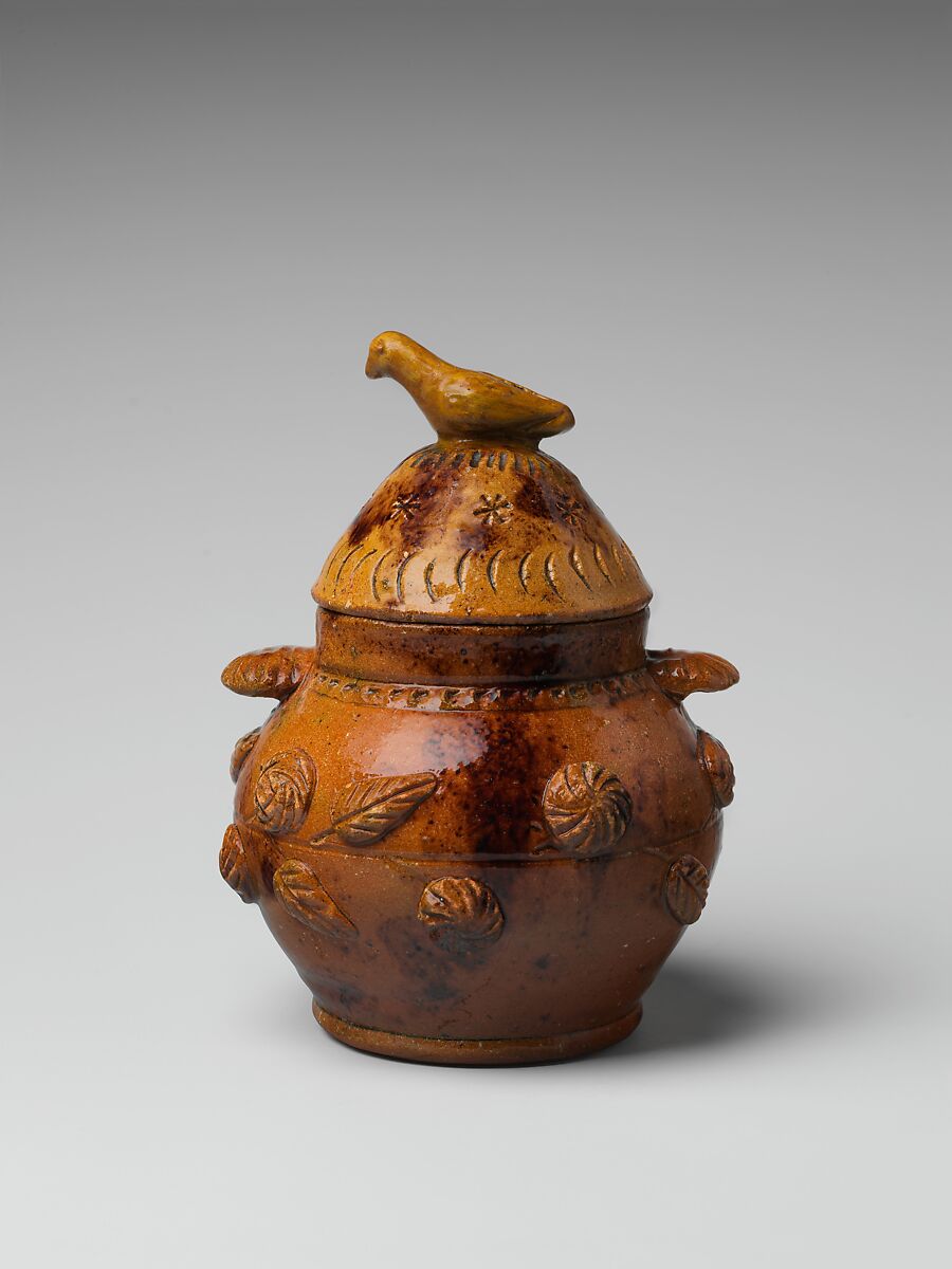 Mackley worked with Anthony W. Baecher before the latter moved to Virginia. The close similarity of the work of the two potters is seen here in the applied stylized leaves and the floral elements in high relief.