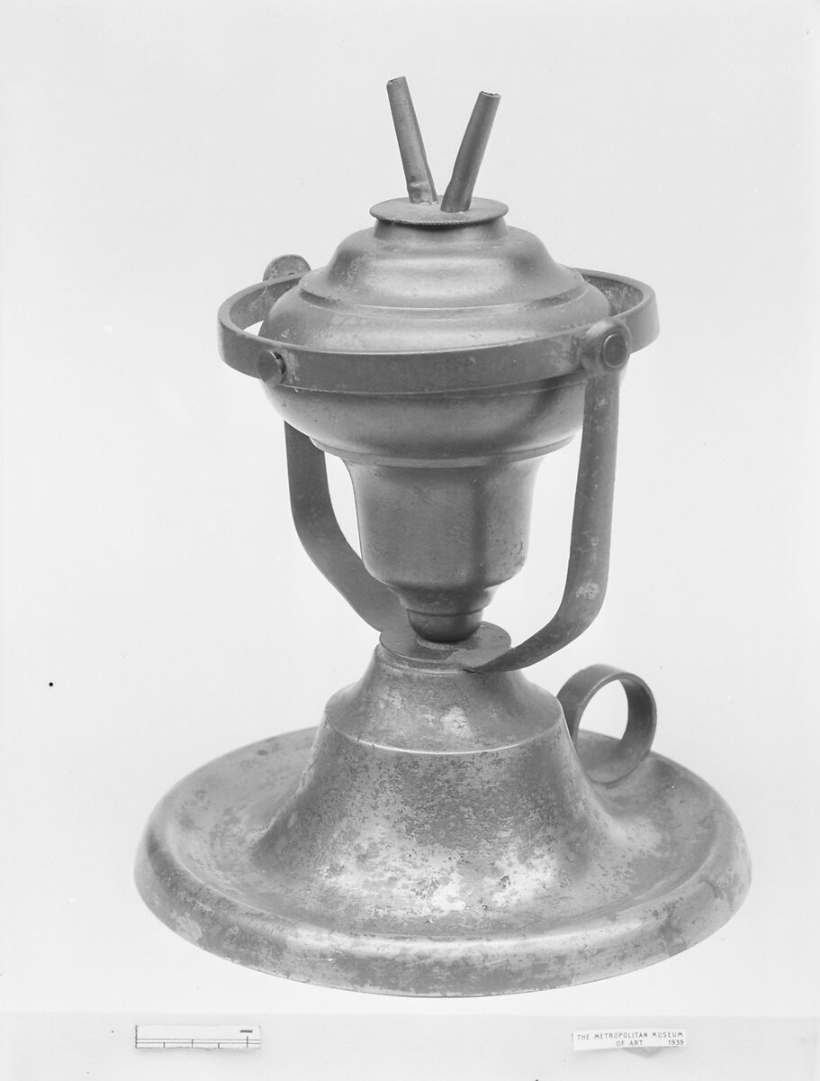 This lamp is known as a swinging or swivel lamp because the font or fuel reservoir is hinged, thereby ensuring that it can always be adjusted to an upright position. Such lamps were used both on flat surfaces and were hung on walls; hence, they were also sometimes called sconce lamps. The firm of Yale and Curtis were located initially on New York's Beekman Street, and later on Fulton Street in that city.