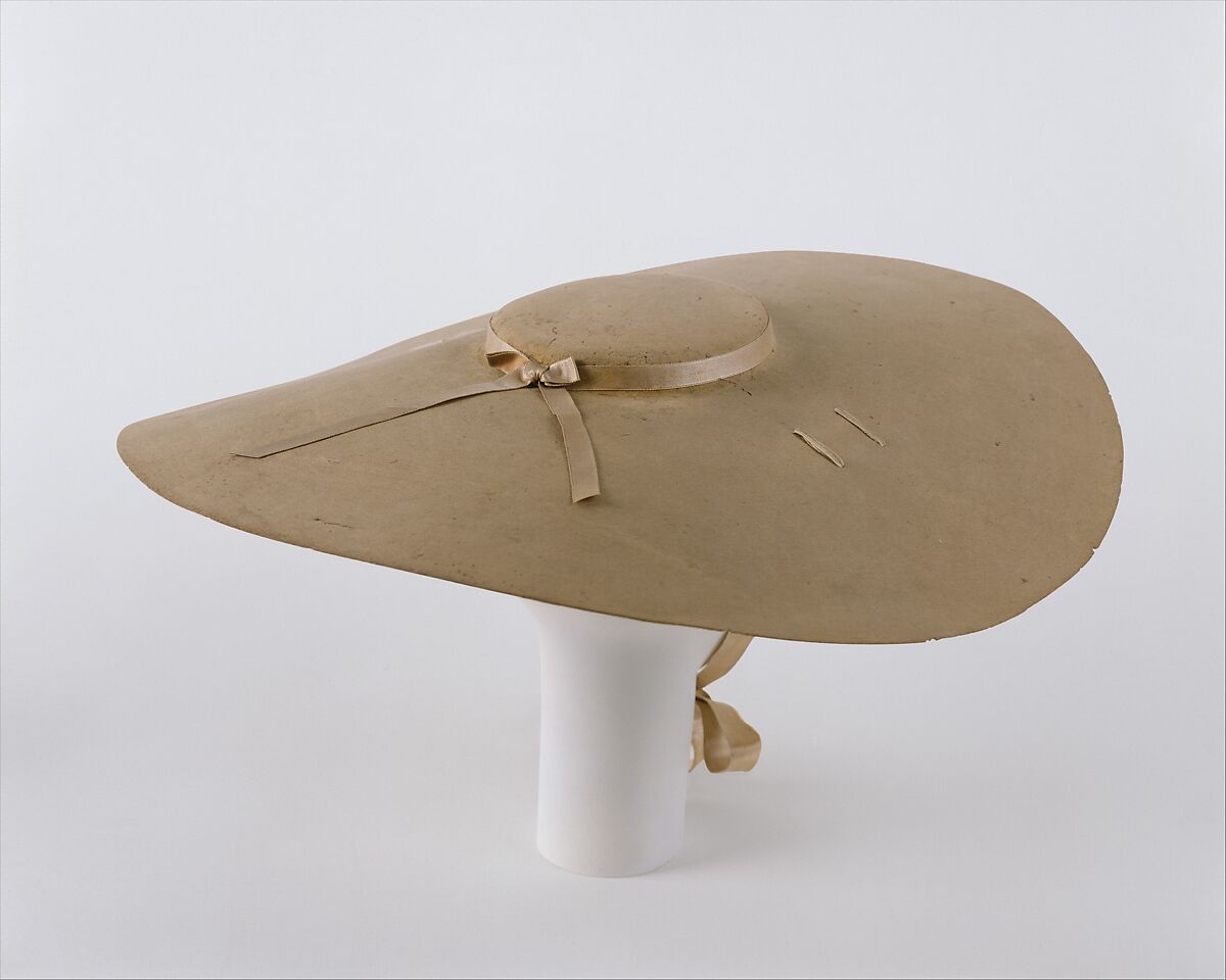 The flat and grandiose cartwheel, firmly secured to the head, was the favored hat type of the second quarter of the eighteenth century. Few survive; this is an exceptionally fine example.
