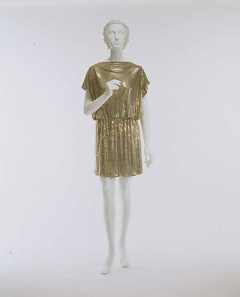 Gianni Versace used metal mesh in a number of his collections. The ability of the material to drape in liquid gathers made it ideal for classical effects. However, it is technically challenging to join, since sewing it is precluded. Perhaps, because of this, the designer relied on simple orthogonal pattern pieces whenever he utilized this medium. That his chiton appears as much medieval as it does classical is the consequence of the chiton's unfitted shift-like structure-common to many cultures and times.