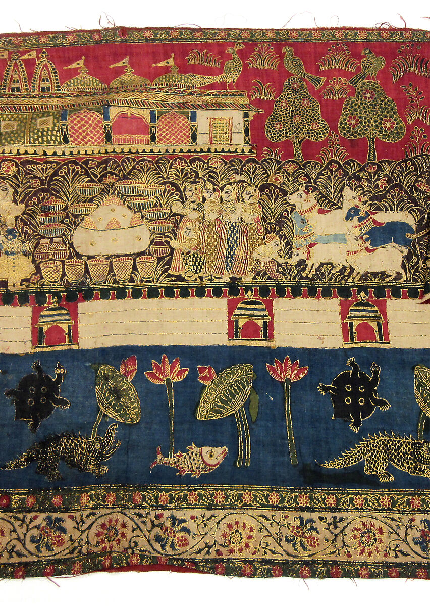 This painted textile represents the lower border of a large scale and high quality picchavai, a devotional temple hanging. Dedicated to the veneration of Lord Krishna as Shrinathji, believed to be a self-manifested form of Vishnu that appeared as a black stone icon of his avatar as Krishna. Traditionally much venerated by rural worshippers, and especially those associated with cowherds, a genre of painted cloth emerged, employed as backdrops to the black stone icon, and as substitutes for it when worshipped away from Nathdwara. This panel has a series of vignettes depicting a range of devotional scenes associated with Krishna’s youthful adventures, as recounted in the Bhagavad Purana.
