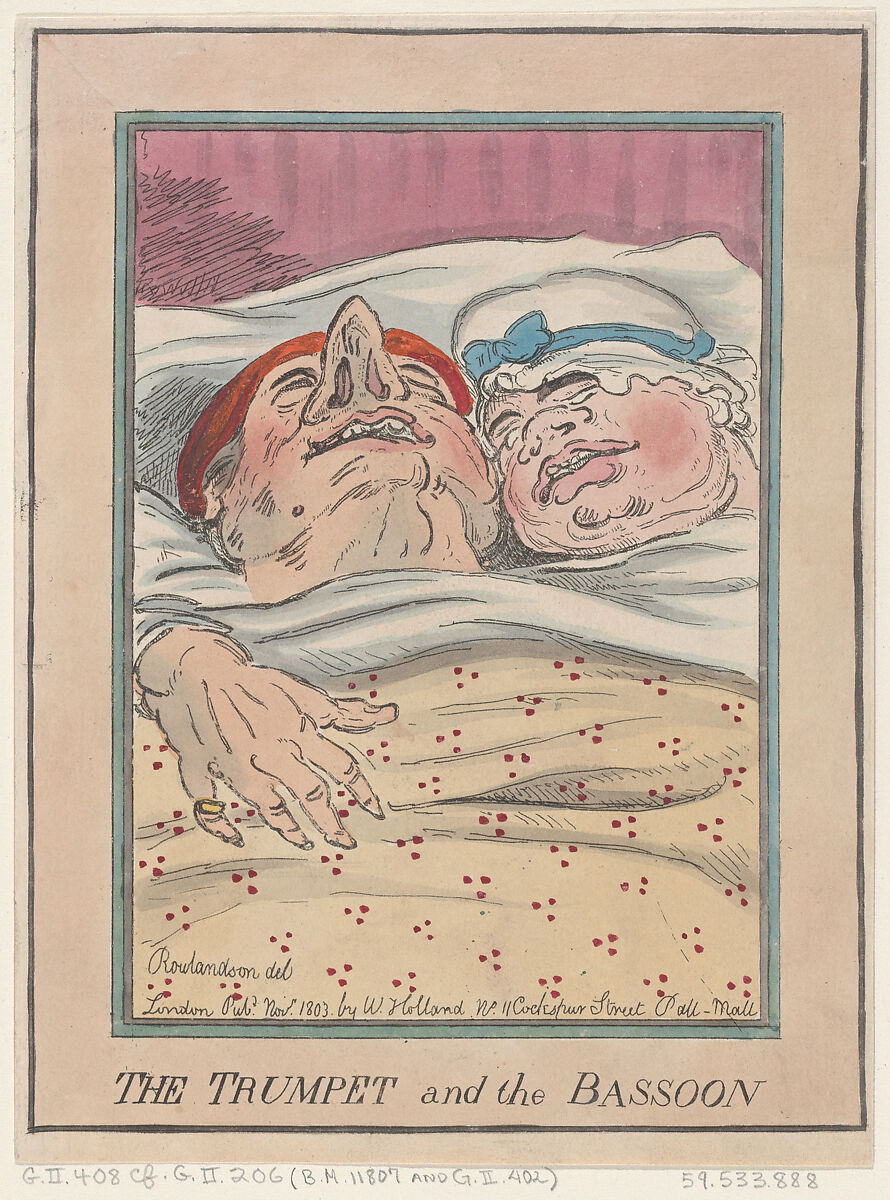 This is one of two prints that Rowlandson devoted to a snoring couple, using the title to suggest that the man projects a lower sound and the woman a higher. This 1803 version, published by William Holland, centers on the two sleepers snuggled together. In 1811 Rowlandson adapted the idea for Thomas Tegg and expanded the view to include the bedroom (see 17.3.888-11, 59.533.1398, and 59.533..2017; for other impressions of this image see 59.533.2018).