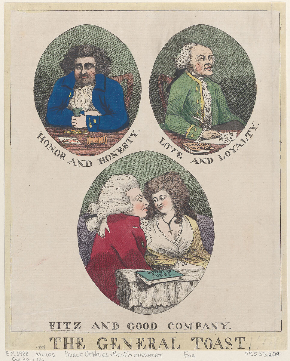 Three oval designs representing prominent figures in London, each lettered with a satirical toast. At upper left a half length portrait of Fox smiles as he sits at a gaming table, holding a dice-box; coins, with another dice-box, coins, and a Knave of Clubs, before him. Lettered "Honor and Honesty." Next to this is a portrait of John Wilkes seated writing with a quill, "No 45, To The..." and a copy of "Essay on Woman" next to him. This is lettered "Love and Loyalty." Below is a larger oval containing portraits of George, Prince of Wales and Mrs. Fitzherbert, who places her arm around the prince's shoulder as they gaze into one another's eyes. Near them on a table is a book lettered "Morriss Songs," and the toast below: "Fitz and Good Company."