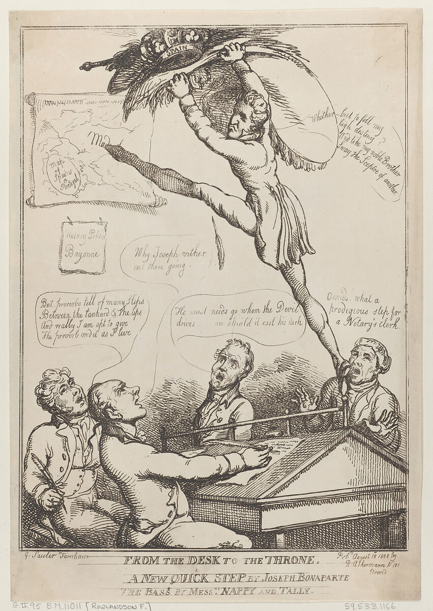 Joseph, dressed as a lawyer, steps atop a desk with his right toe, while extending his other leg to point his left toe at a map of Spain and Portugal, at Madrid. His hands are raised above his head to hold onto cushions on which is the crown of Spain. Four clerks sit facing each other at the desk he has left, which has double slopes, divided by the low rail from which he steps. One asks: "Why Joseph wither art thou going"; he looks down answer: "Whither - but to fill my high destiny? And like my noble Brother Sway tne Sceptre of another." The other clerks say respectively: "But proverbs tell of many Slips Between the tankard & the lips And really I am apt to give The proverb credit as I live"