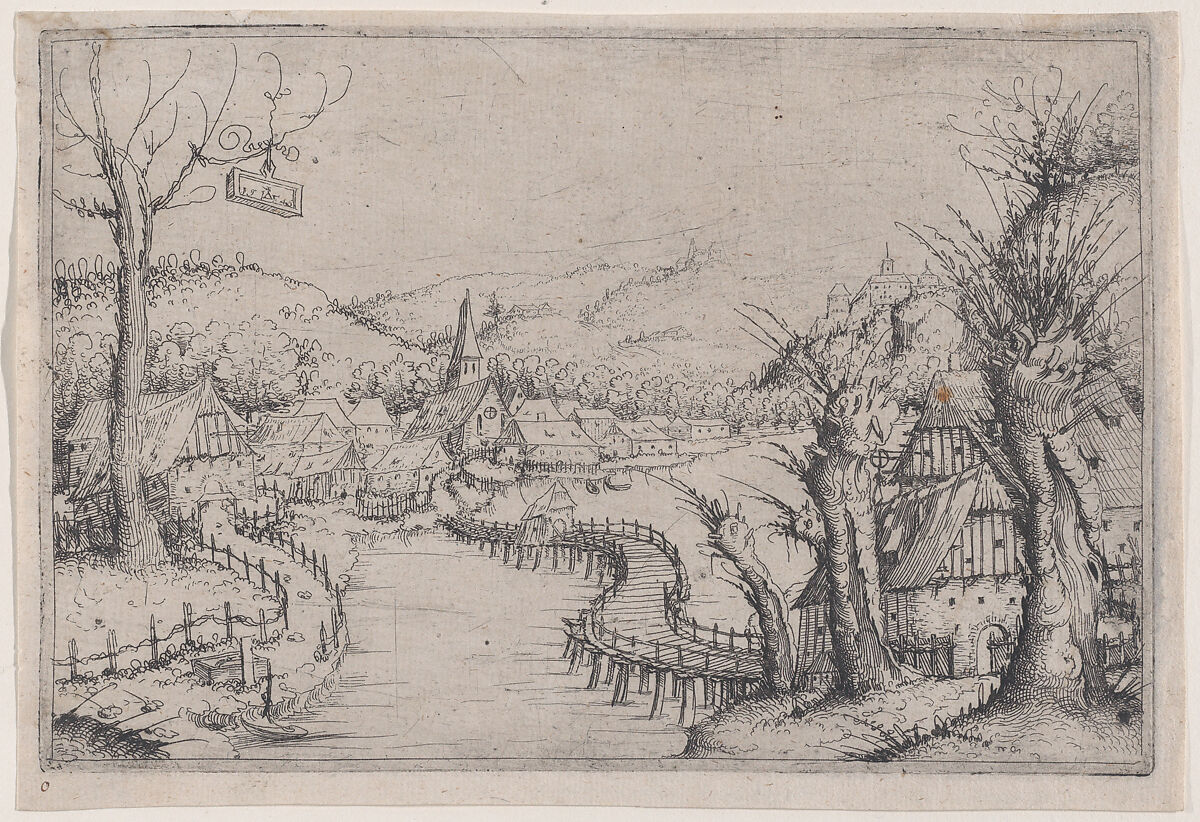 - Title: River Landscape with Three Bare Willow-Trees at Right and a Long Winding Wooden Bridge at Center Leading to a Village