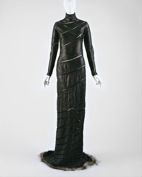 Worn by Madonna at the "Fire and Ice Ball" honoring Donatella Versace in Los Angeles in December 1998, the zipper-gyration evening gown promises net transparency and/or the unraveled revelation of the body. Most importantly, Donatella Versace has taken one of her brother's signatures--the dress with see-through plastic or plastic seams--and expanded it into a more extravagant creation of her own. The second Versace designer is now in command of the signature and is taking it in her own design direction. Gianni Versace was a generous donor to The Costume Institute; his sister now continues that tradition.