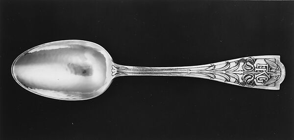 In the 1890s the Gorham Manufacturing Company introduced a line of handmade silver with a hammered finish, which was marketed under the name Martelé. Unique among the firm's efforts in Martelé is this flatware service (1987.242.1-12), created by the Prairie School architect George W. Maher (1864–1926) for Rockledge, the summer residence he designed in 1912 for Ernest and Grace King near Winona, Minnesota. A single place setting consists of twelve pieces, each chased with the Kings' monogram, which is intertwined with lily blossoms. Lilies, which grew locally in wild profusion, also ornament other furnishings and architectural elements at Rockledge, as does Maher's trademark flattened arch, which here defines the terminal of each handle.