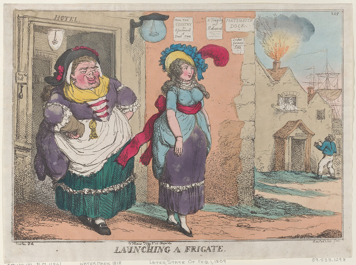 A young prostitute, elaborately dressed, walks from the door of a Portsmouth brothel. Behind her is a plump woman, with her hands on her hips. On the wall of the house is the inscription "Portsmouth Dock" and three bills: "From the Country an Assortment of Fresh Ware," "A Tragedy in Rehearsal," and "Leakes Genuine Pills." In the background, a woman leans from the window of a house with outstretched arms, while flames and smoke erupt from the chimney.