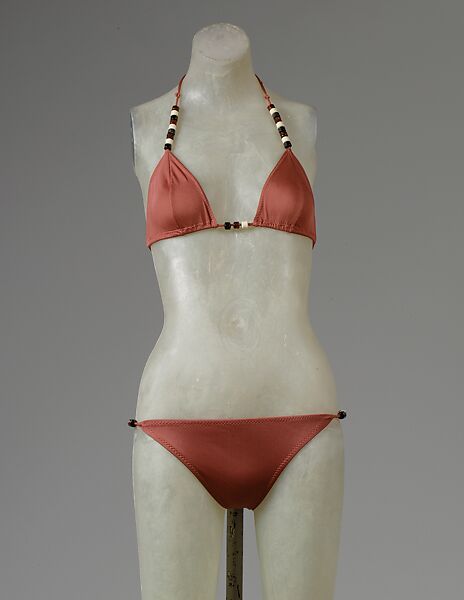 Worn on the beaches of the French Riviera, this string bikini of rust-colored nylon is decorated with beads of black, tortoiseshell color, and ivory. The top ties at the back of the neck and at the center back with a slender string. The suggestive bottom has beads at both hips.